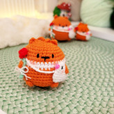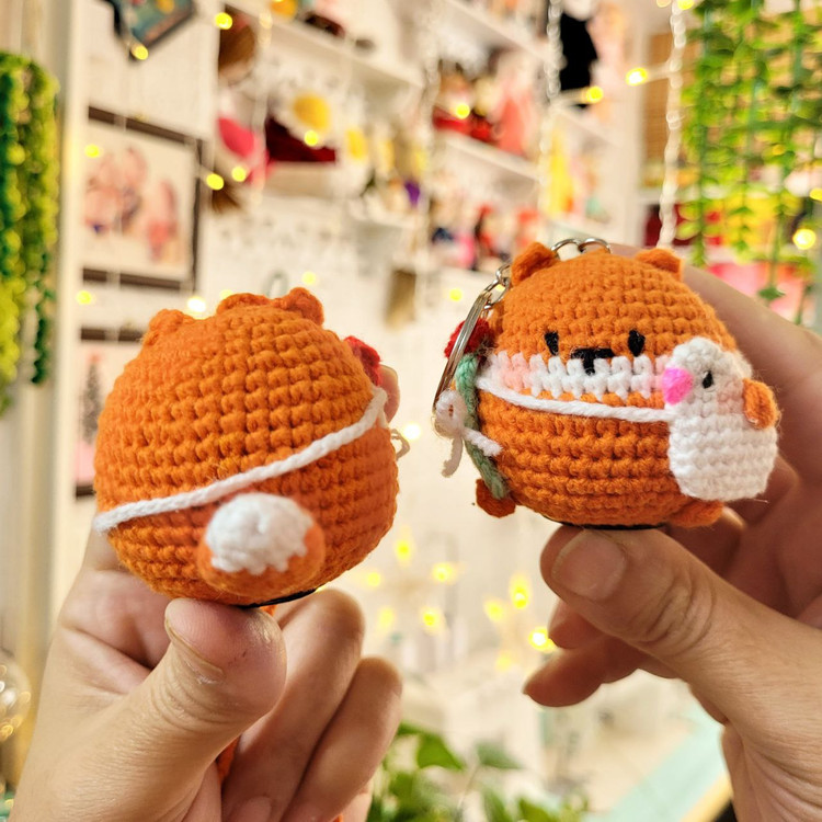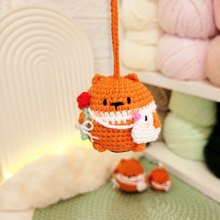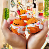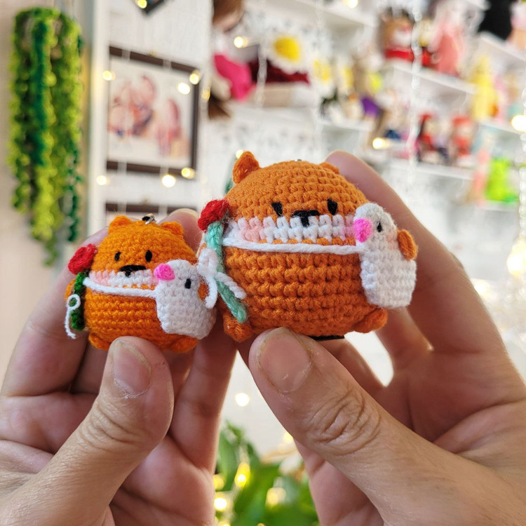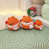 آویز جا کلیدی قلاب بافی خانواده کپل روباه که ۲ عدد سایز بزرگ و یک عدد سایز کوچک بافته شده است.