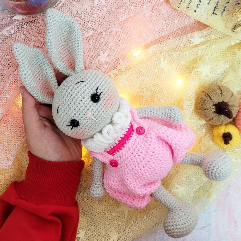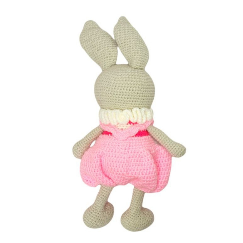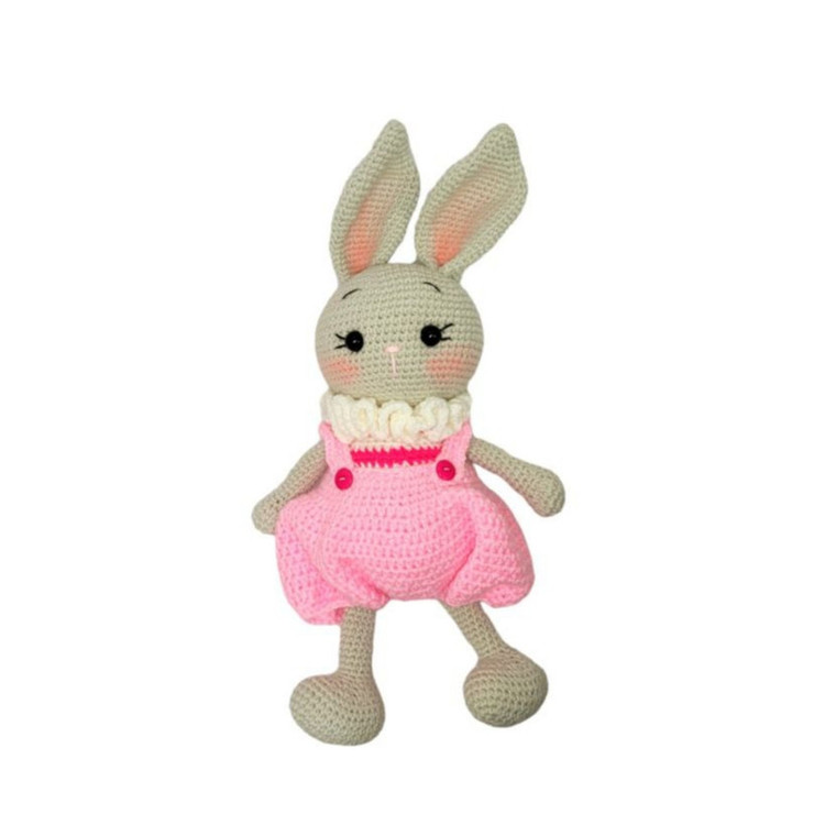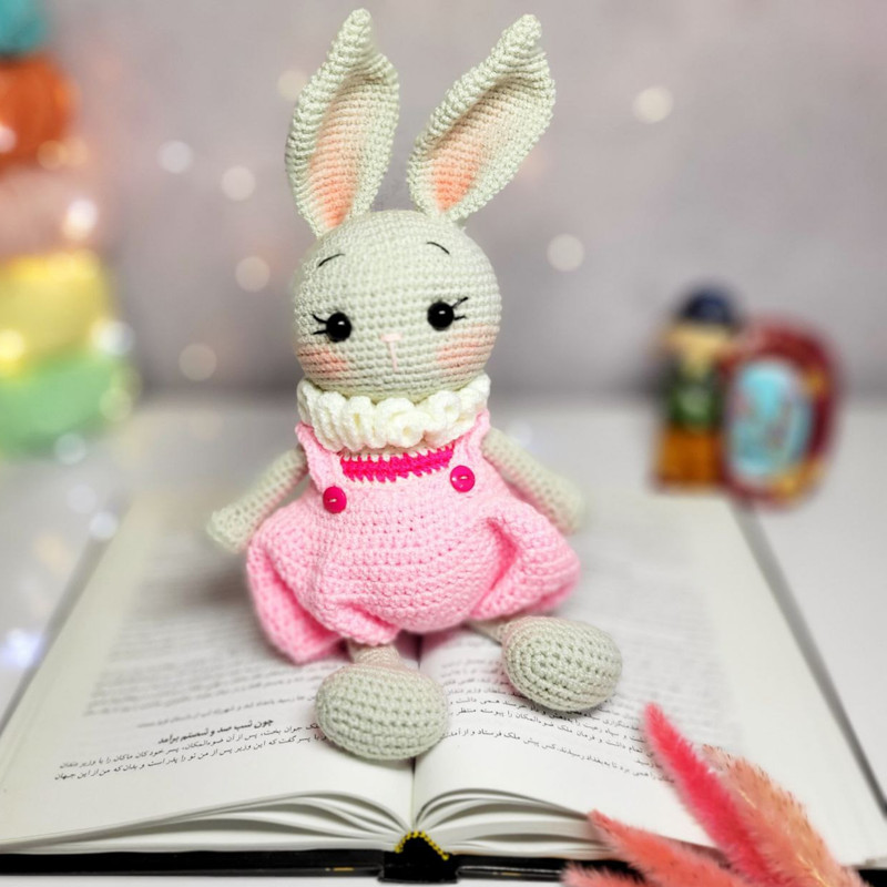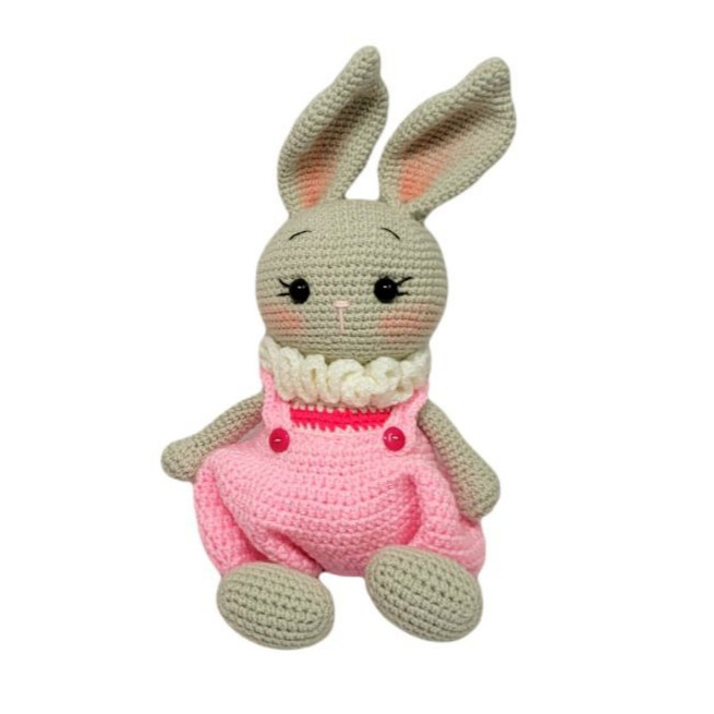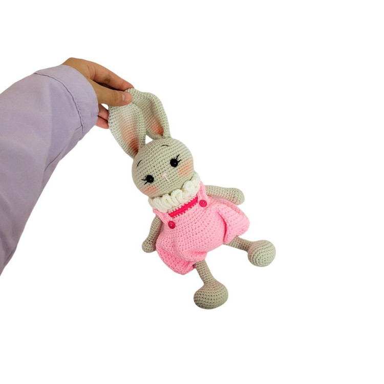 عروسک قلاب بافی مدل خرگوش هونی با کاموای مرغوب ایرانی بافته شده و با الیاف درجه یک پر شده است. لباس این مدل جدا بافته شده است و به صورت تزئینی به عروسک پوشانده شده است. حالت پای عروسک به صورتی است که قابلیت نشستن و آویز شدن پا را دارد. دکمه ها و تمام اجزا دوخته شده است و کاملا ایمن است. قد عروسک حدود ۳۰ سانت است.