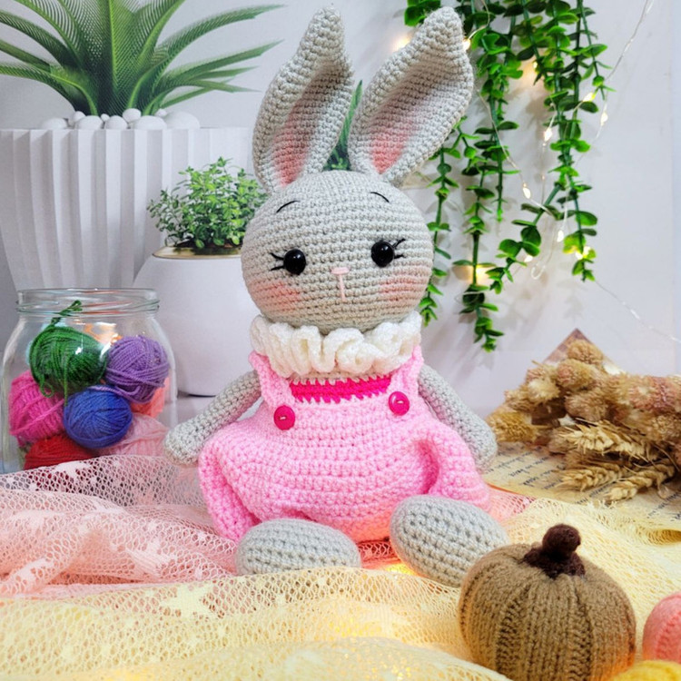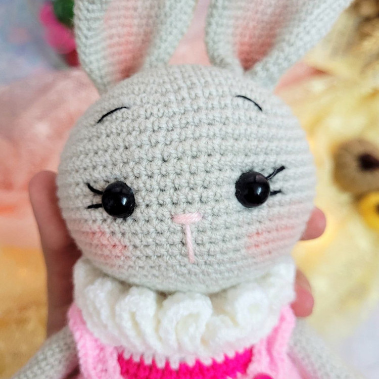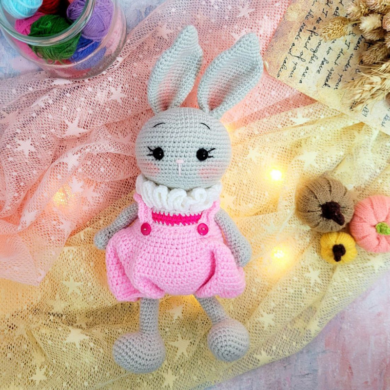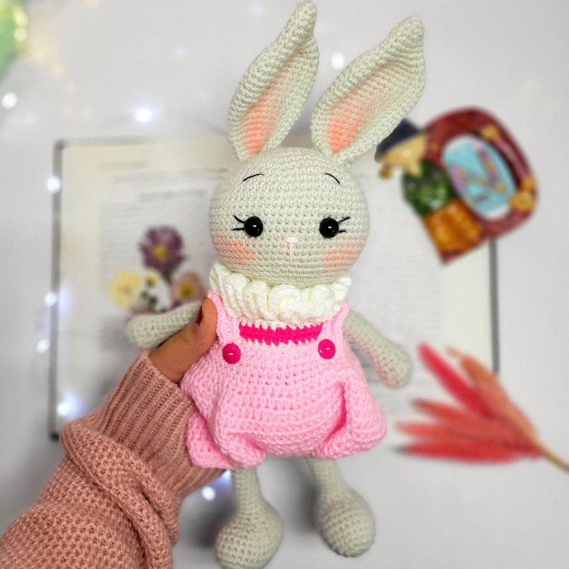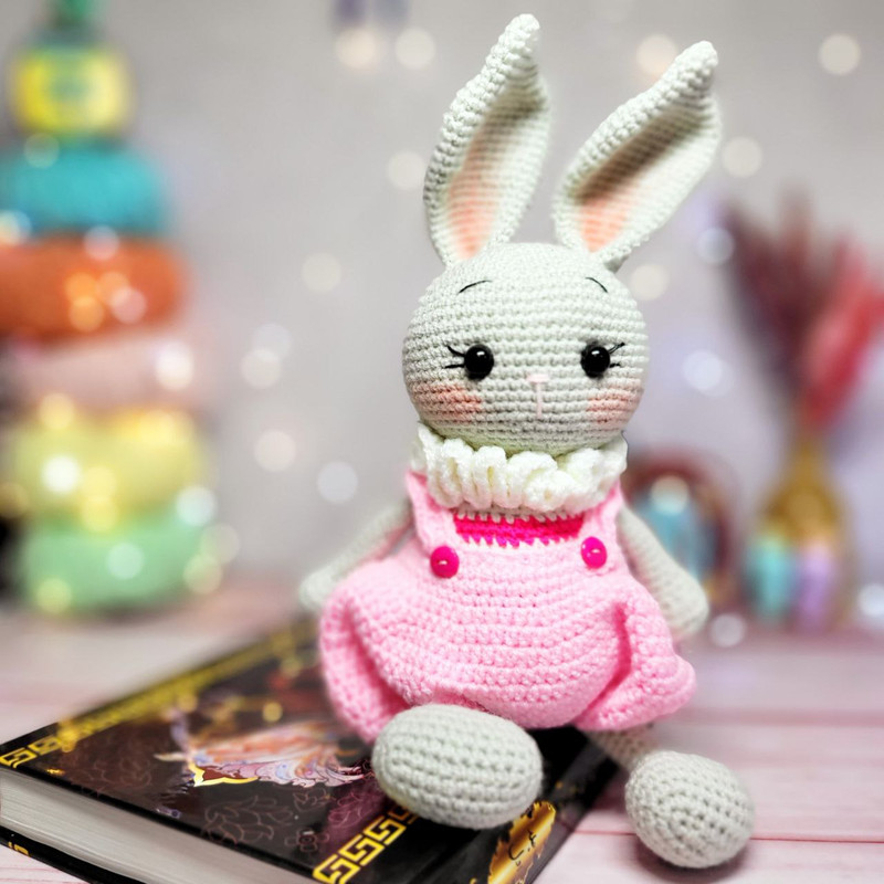 عروسک قلاب بافی مدل خرگوش هونی با کاموای مرغوب ایرانی بافته شده و با الیاف درجه یک پر شده است. لباس این مدل جدا بافته شده است و به صورت تزئینی به عروسک پوشانده شده است. حالت پای عروسک به صورتی است که قابلیت نشستن و آویز شدن پا را دارد. دکمه ها و تمام اجزا دوخته شده است و کاملا ایمن است. قد عروسک حدود ۳۰ سانت است.