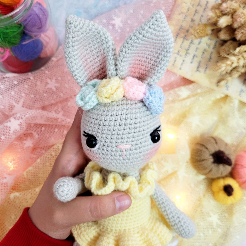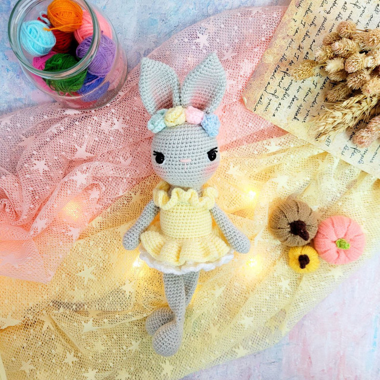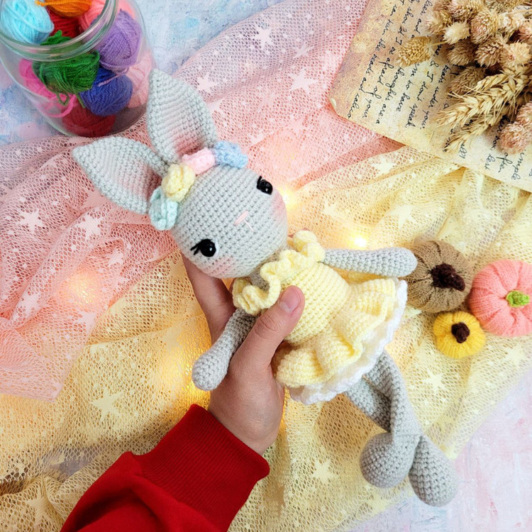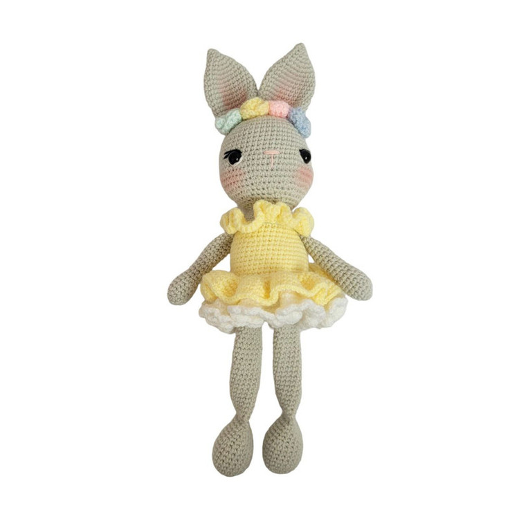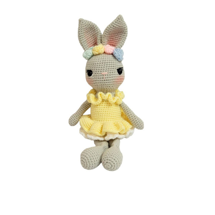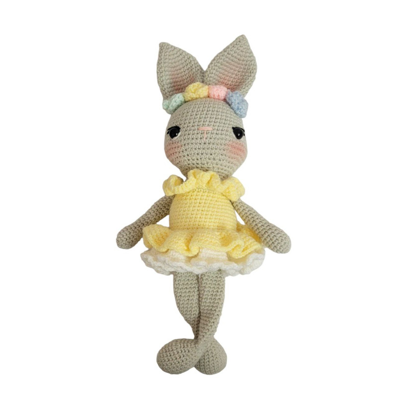 عروسک قلاب بافی مدل خرگوش بل با کاموای مرغوب ایرانی بافته شده و با الیاف درجه یک پر شده است. لباس این مدل قابل جدا شدن نیست و به صورت تزئینی روی خود عروسک بافته شده است. حالت پای عروسک به صورتی است که قابلیت نشستن و آویز شدن پا را دارد. تمام اجزا دوخته شده است و کاملا ایمن است.